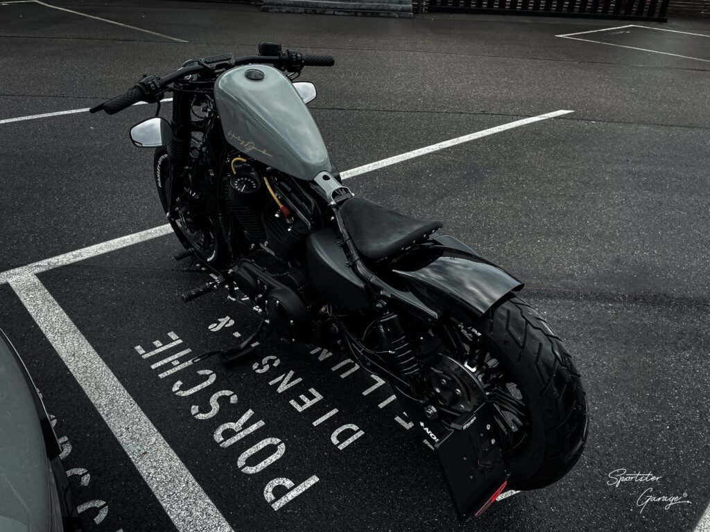 Der Sitz ist auf einer komplett neuen Basis. Es wurde exakt an die Linie der Sportster angepasst, bezogen mit echtem hochwertigem originalen Alcantara (kein billiger Microfaserstoff!).