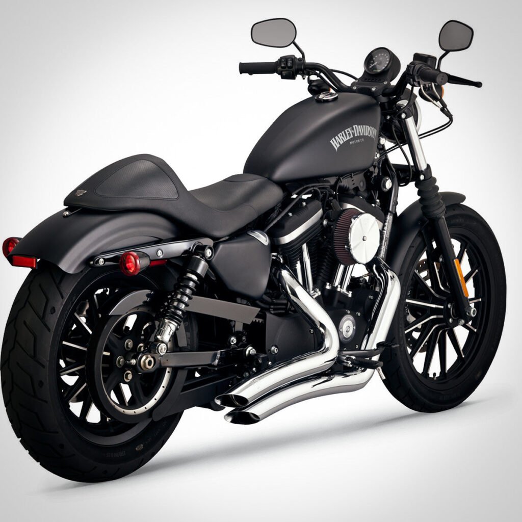 Vance & Hines Big Radius 2-2 for all Sportster models from 2004 onwards. Dark and ominous, the Big Radius Black is now also available for Sportster models from 2014 onwards. The black, ceramic-coated outer skin of the Big Black Radius has a one-piece, full-length heat shield. Silencers are preinstalled for the deep, muffled sound.